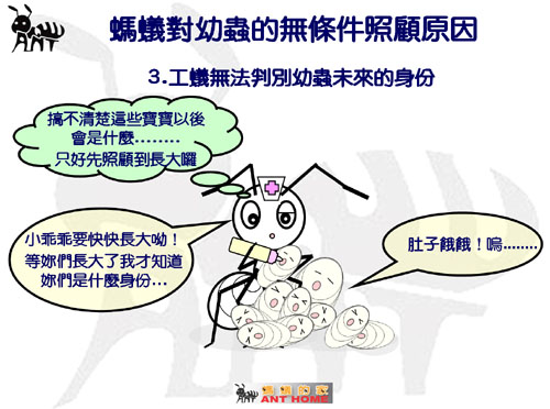 工蟻們在幼蟲尚未完全蛻變成蟲之前,其實根本就無法分辨幼蟲們未來的實際身份,也由於在正常且多數情況下幼蟲大多數的身份多為"工蟻",亦是未來蟻國擔任工作和覓食、守衛、戰鬥的基本成員,因此工蟻們會將幼蟲視為必須最優先照顧和保護的對像,所以工蟻在面對所有的幼蟲