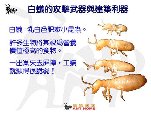 這麼看起來........這白拋拋、軟綿綿、看似毫無招架之力的白蟻似乎就只能逆來順受、飽受欺侮........若這樣長久下去........白蟻不滅亡才怪呢!其實並不然!
