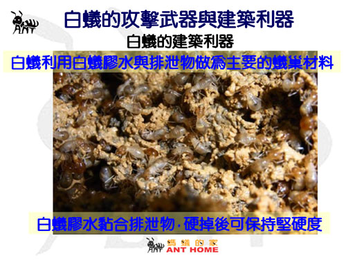 當白蟻修築蟻巢時,牠們會使用自己所排泄的糞便與口中吐出的液態白膠一起混合,製造出蟻巢壁面或隔間,當白蟻巢遭到螞蟻強行突破與攻擊時,白蟻群會在很短的時間內,有組織性的將洞穴入口以白膠或混合周邊材料與排泄物將洞穴入口快速封閉,以阻止螞蟻長驅直入造成更大的傷害!