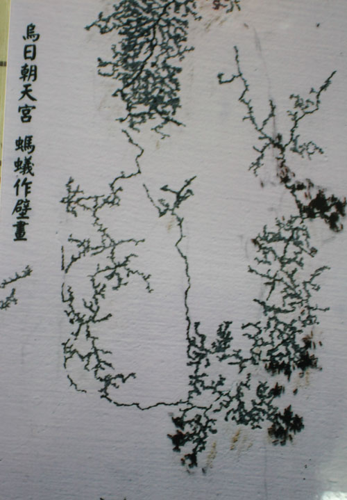 〔自由時報記者俞泊霖/烏日報導〕烏日區朝天宮有幅「螞蟻壁畫」,遠觀如多株松樹,細看卻是一道道蟲蛀痕跡,廟方指出畫作是螞蟻啃咬而成,視為神蹟,保留多年來不敢破壞。螞蟻達人侯修煒則說,牆面有蟲蛀行為,若是螞蟻所為,可能牆面存有某種氣味。